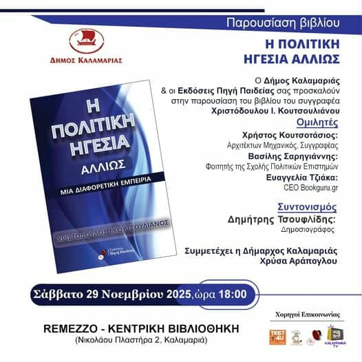 Παρουσίαση βιβλίου “Η Πολιτική Ηγεσία Αλλιώς” στις 29/11/2025 Σάββατο στην Κεντρική Βιβλιοθήκη – Remezzo (Νικολάου Πλαστήρα 2, Καλαμαριά)